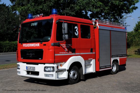 Tragkraftspritzenfahrzeug mit Wassertank Funkrufname: Florian Brakel 14-TSFW-1 Fahrgestell: MAN TGL8.180 Aufbau: BTG – Brandschutztechnik Görlitz Baujahr: 2013 Leistung: 180 PS Gewicht: 7490 kg Wassermenge: 750 Liter Besonderheiten: Pneumatischer LichtmastRückfahrkameraMultifunktionsleiterFettbrandlöscherMittelschaumpistoleMotorkettensäge