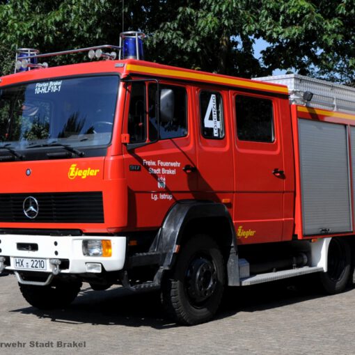 Hilfeleistungslöschgruppenfahrzeug HLF10 Funkrufname: Florian Brakel 10-HLF10 Fahrgestell: Mercedes Benz Aufbau: Ziegler Baujahr: 1994 Leistung: 170 PS Gewicht: 9.000 kg Wassermenge: 600 Liter Besonderheiten: Ausklappbarer LichtmastStromerzeugerRettungssatz Fa. WeberSpineboardelektro-SäbelsägeMotorkettensägeMittelschaumpistole