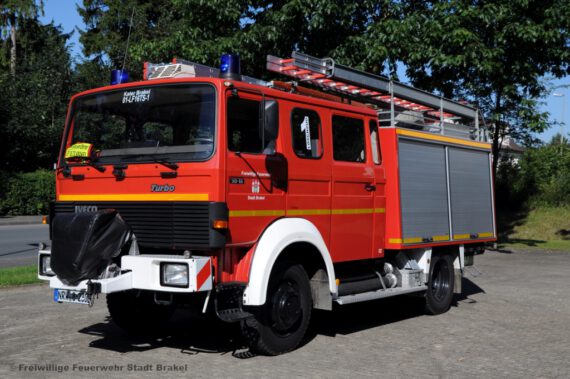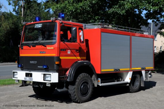 Tanklöschfahrzeug TLF3000 Funkrufname: Florian Brakel 01-TLF3000-1 Fahrgestell:Iveco 90-16 Aufbau: Schmitz Baujahr: 1993 Leistung: 170 PS Gewicht: 9200 kg Wassermenge: 2400 Liter Besonderheiten: Hitzeschutzanzüge Form B (Ponchos)tragbarer Schaum- WasserwerferKettensäge Verbleib: Bauhof Stadt Brakel